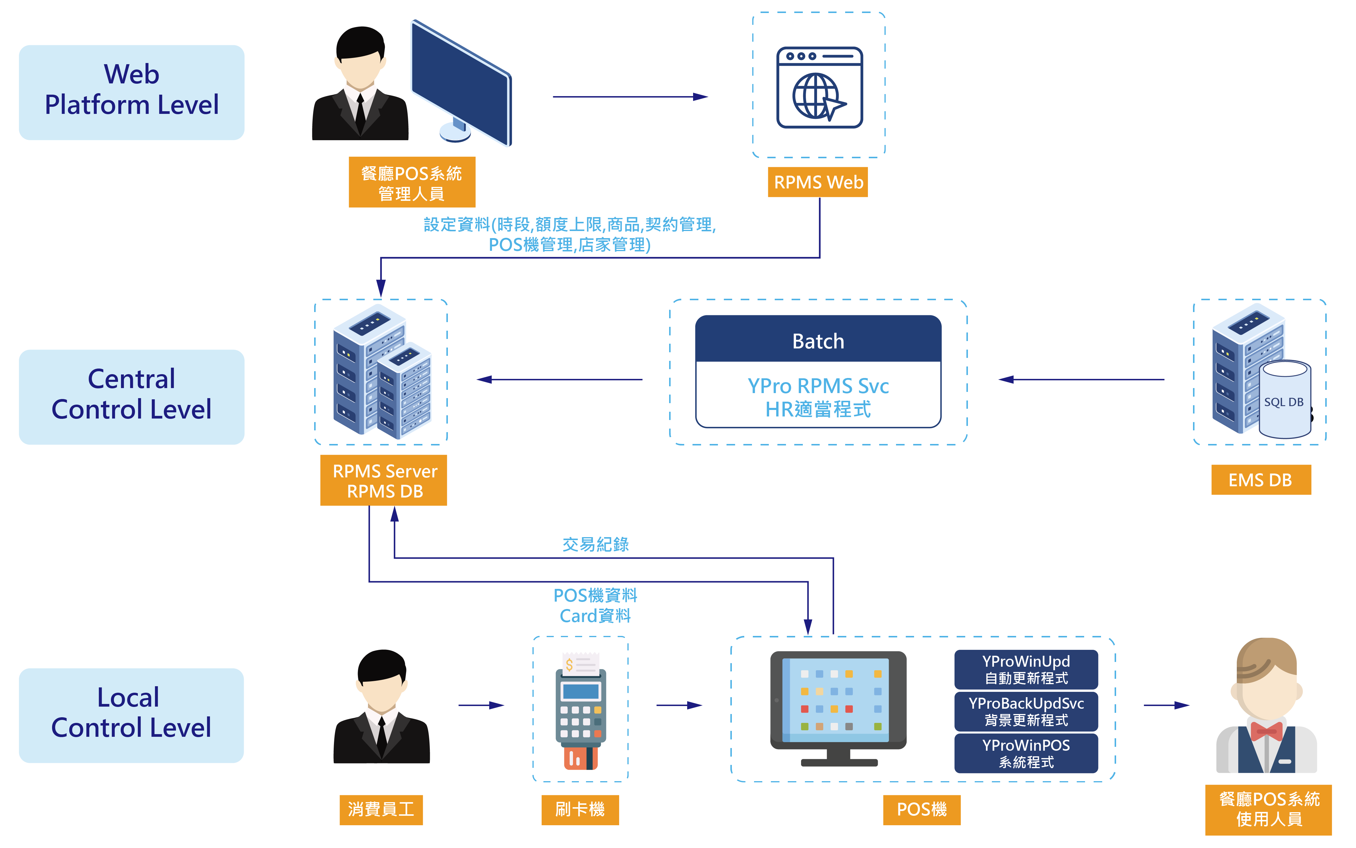 RPMS餐飲POS管理提供消費紀錄、報表、商家社置等功能,應用於餐飲消費上,特色包含能即時掌控營運狀況、協助庫存管理同步以輕鬆處理補貨作業,可即時產出銷售報表以提升營運效率,並有效提高服務品質及店內的效率,讓用餐體驗更好。